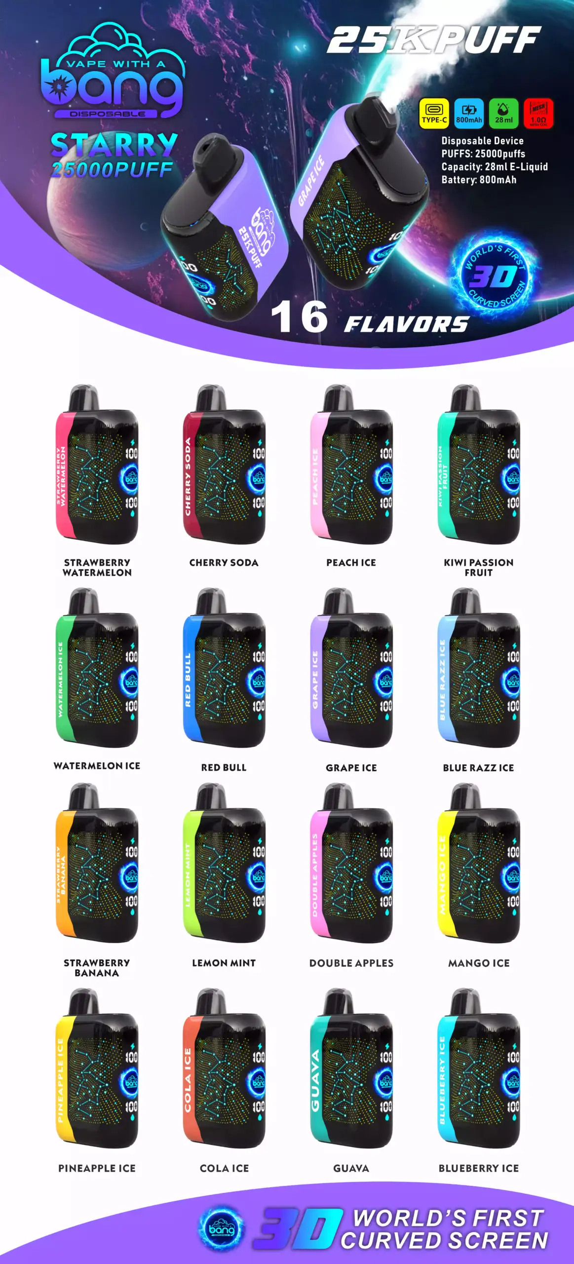 Der Bang STARRY 25000 Puffs bietet eine Vielzahl von verlockenden Aromen, darunter Strawberry Watermelon, Peach Ice und Red Bull. Egal, ob Sie fruchtige, erfrischende oder süße Geschmacksrichtungen bevorzugen, dieser Vape erfüllt alle Wünsche.